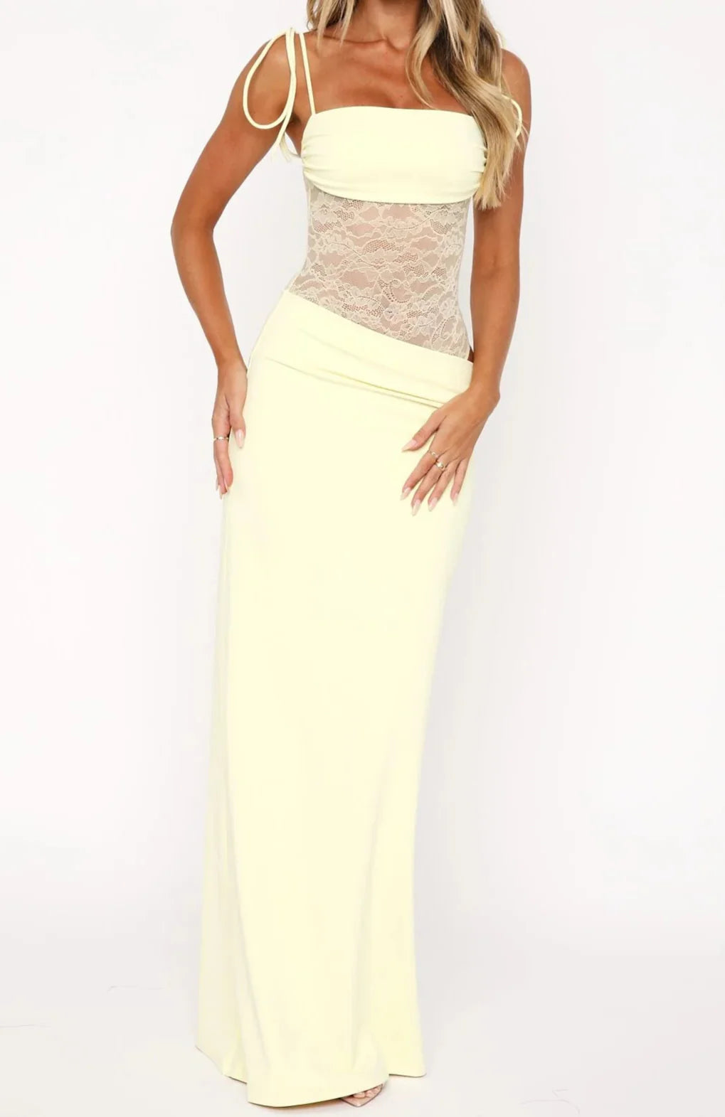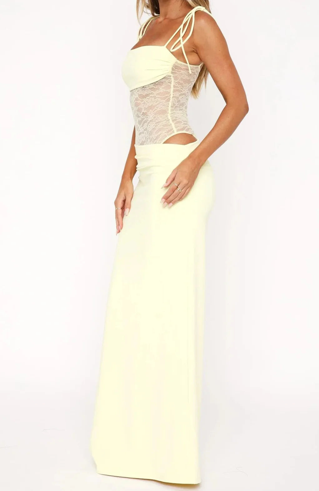 Show off your playful side in the Admire Me Maxi Dress Lemon. Featuring thin, self tie adjustable shoulder straps, square neckline, lined at bust, sheer, lace bodice detailing with side cut out design, snap fastener at crotch, maxi length and stretch material for an easy slip on design.